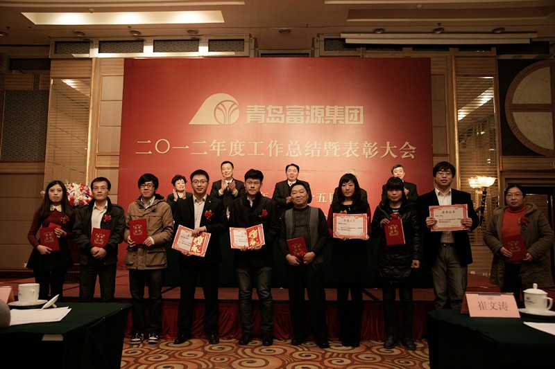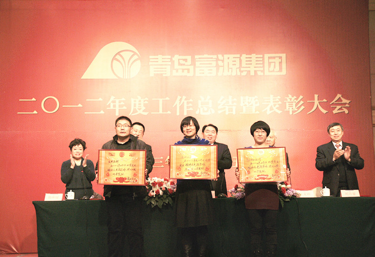 2013年1月25日,青岛富源集团二〇一二度工作总结暨表彰大会在汇泉王朝大饭店举行。集团董事长、总裁孙久学,副总裁王文忠、隋和媛、王文田、刘吉豪出席会议并在主席台就座。集团各公司、部门、工厂代表共100余人参加会议。会议由隋和媛副总裁主持。