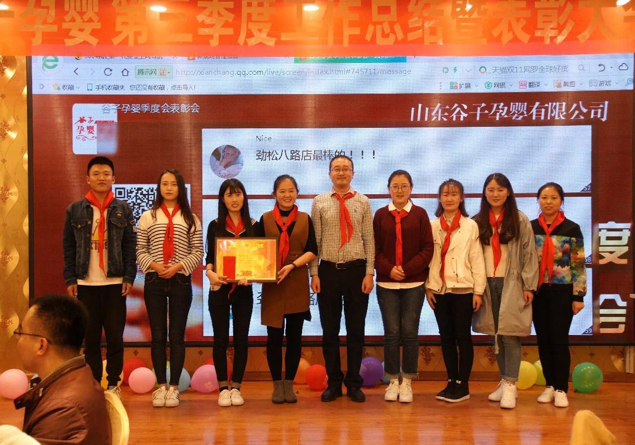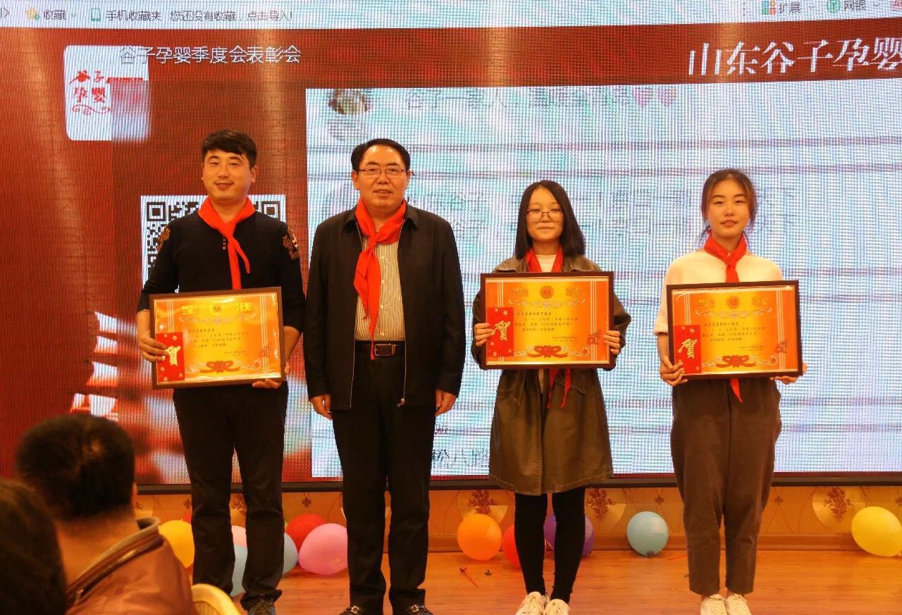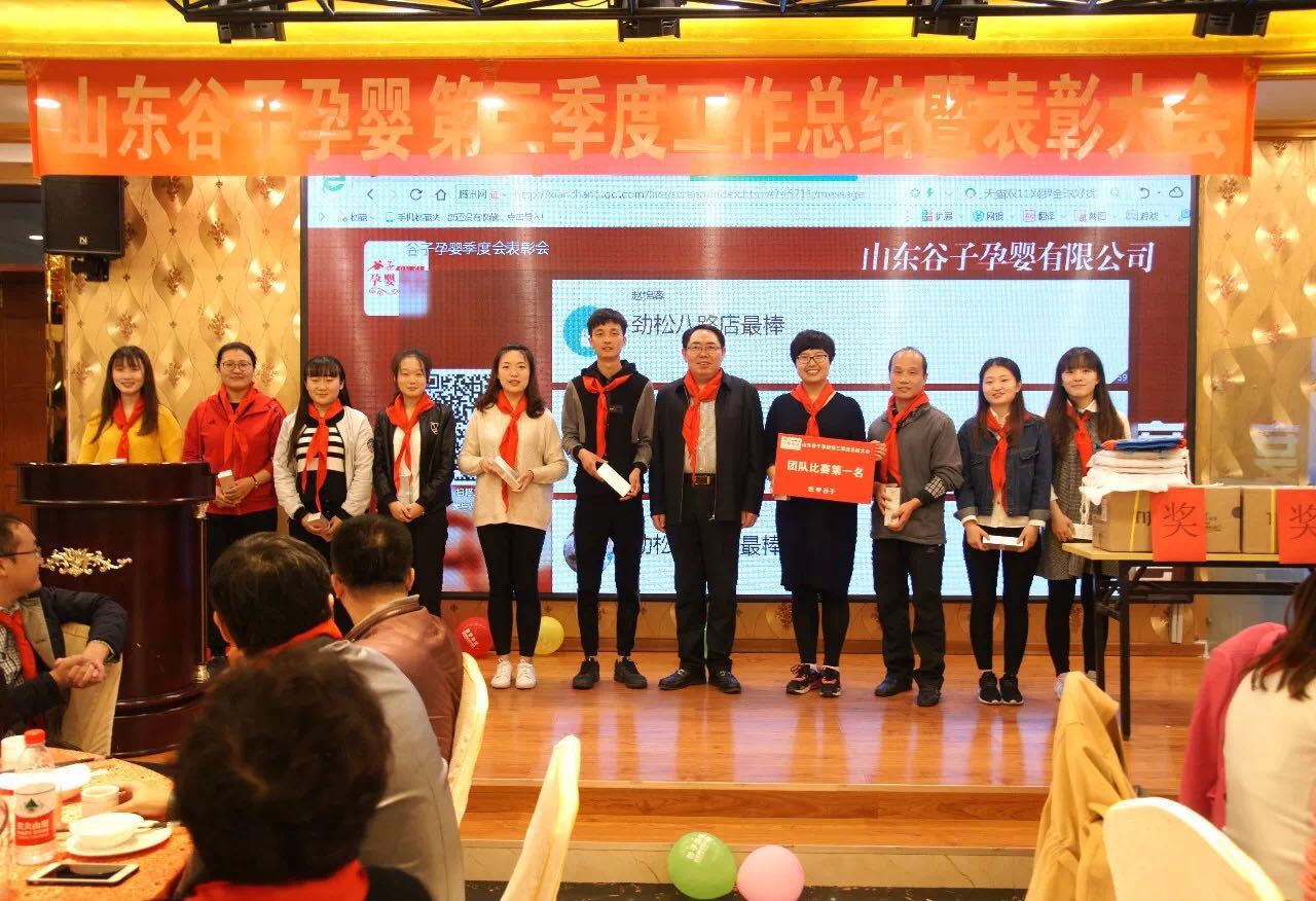 总结发言结束后,富源集团董事长、总裁孙久学,副总裁王文忠以及山东谷子孕婴董事长崔文涛依次为先进集体及个人颁发奖状及奖品,对在上一季度为谷子做出突出贡献的集体及个人提出表彰,将会议推向高潮。