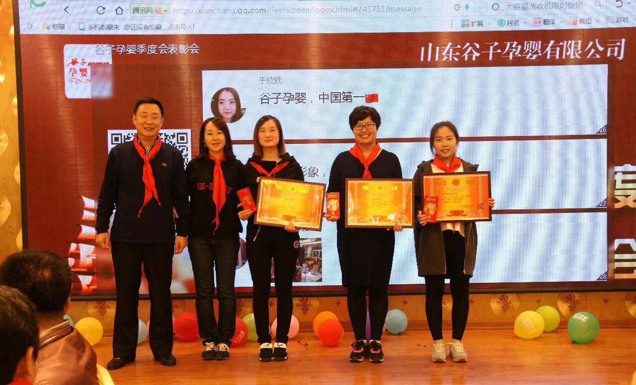 总结发言结束后,富源集团董事长、总裁孙久学,副总裁王文忠以及山东谷子孕婴董事长崔文涛依次为先进集体及个人颁发奖状及奖品,对在上一季度为谷子做出突出贡献的集体及个人提出表彰,将会议推向高潮。