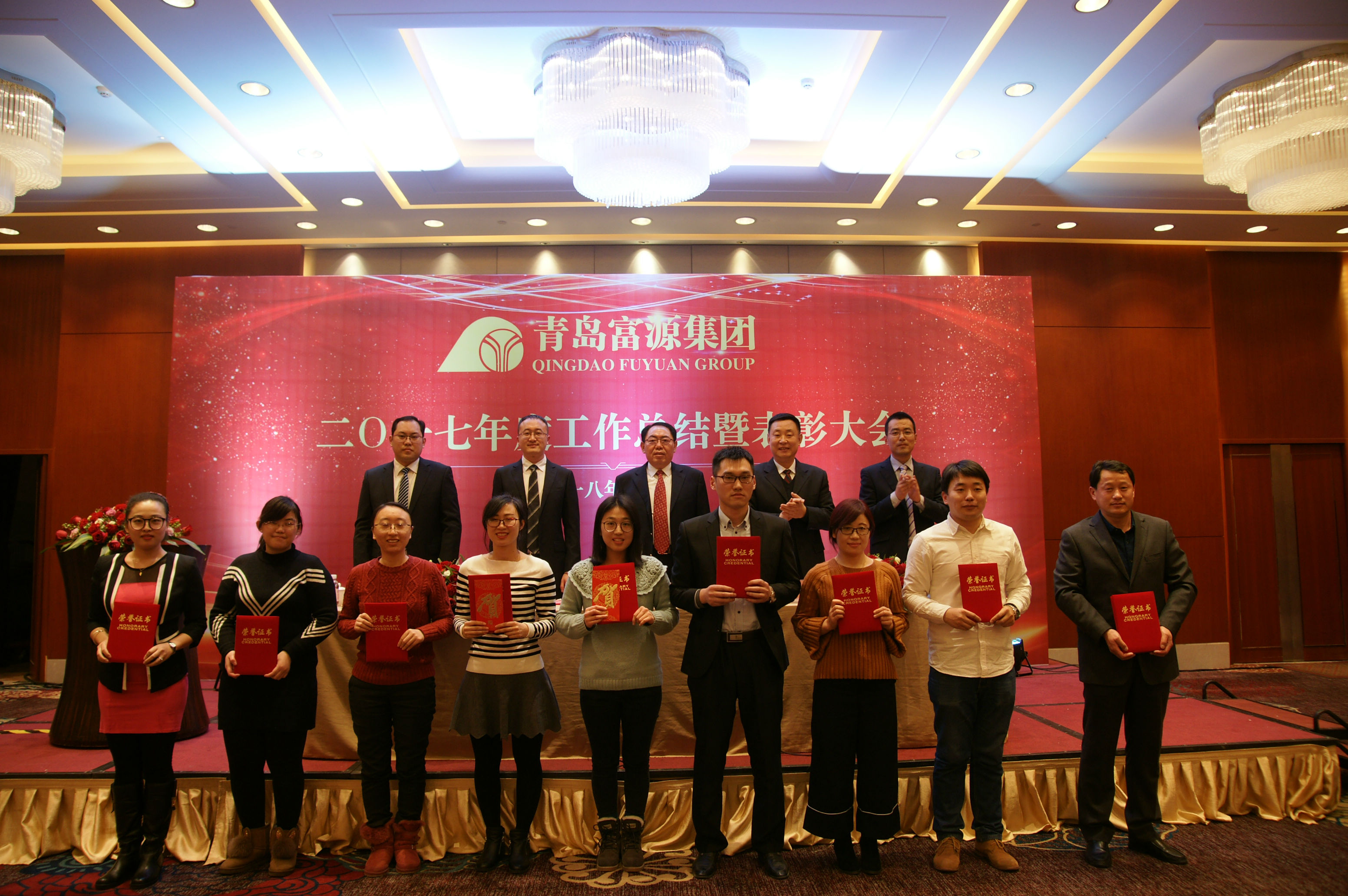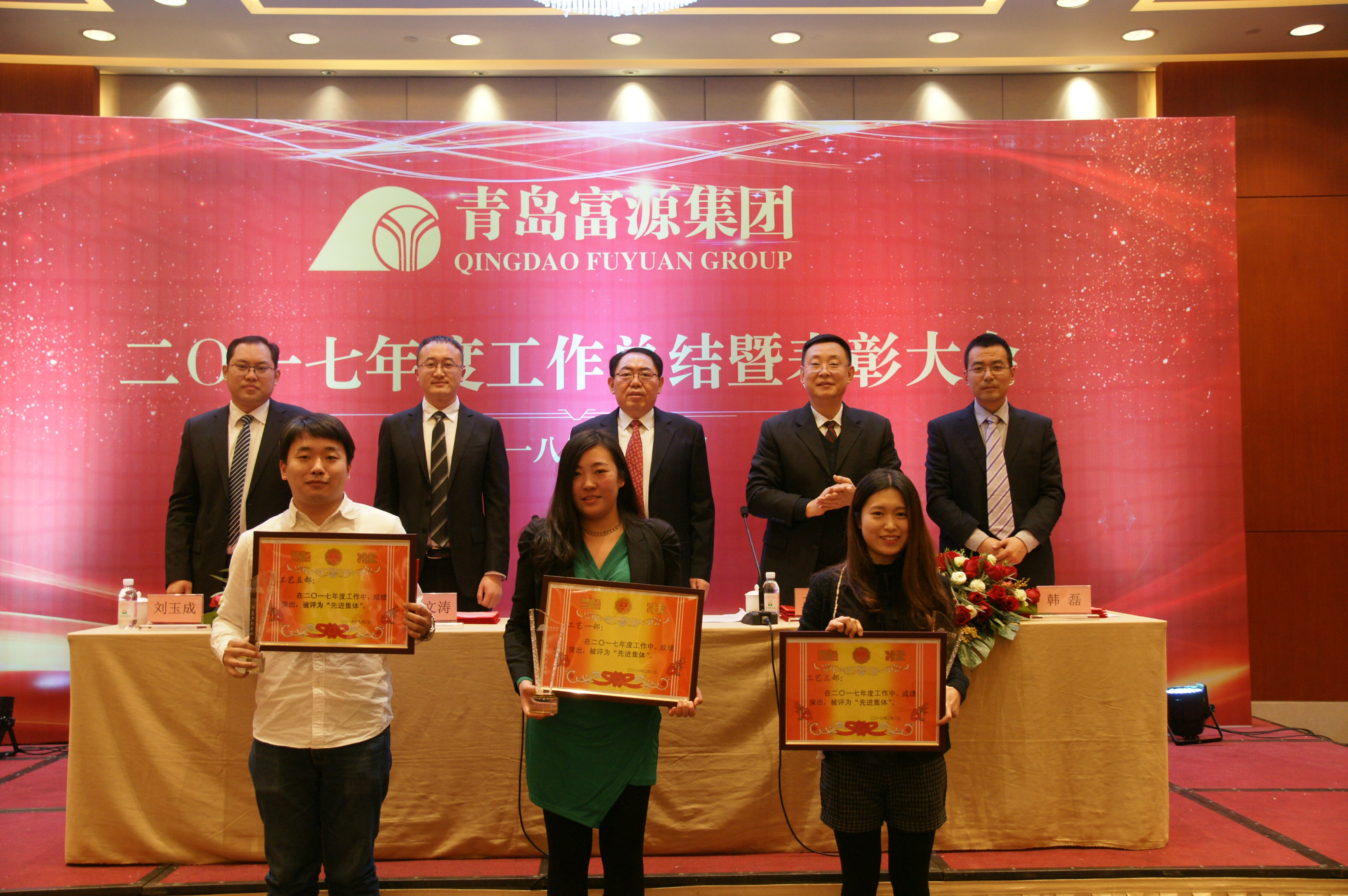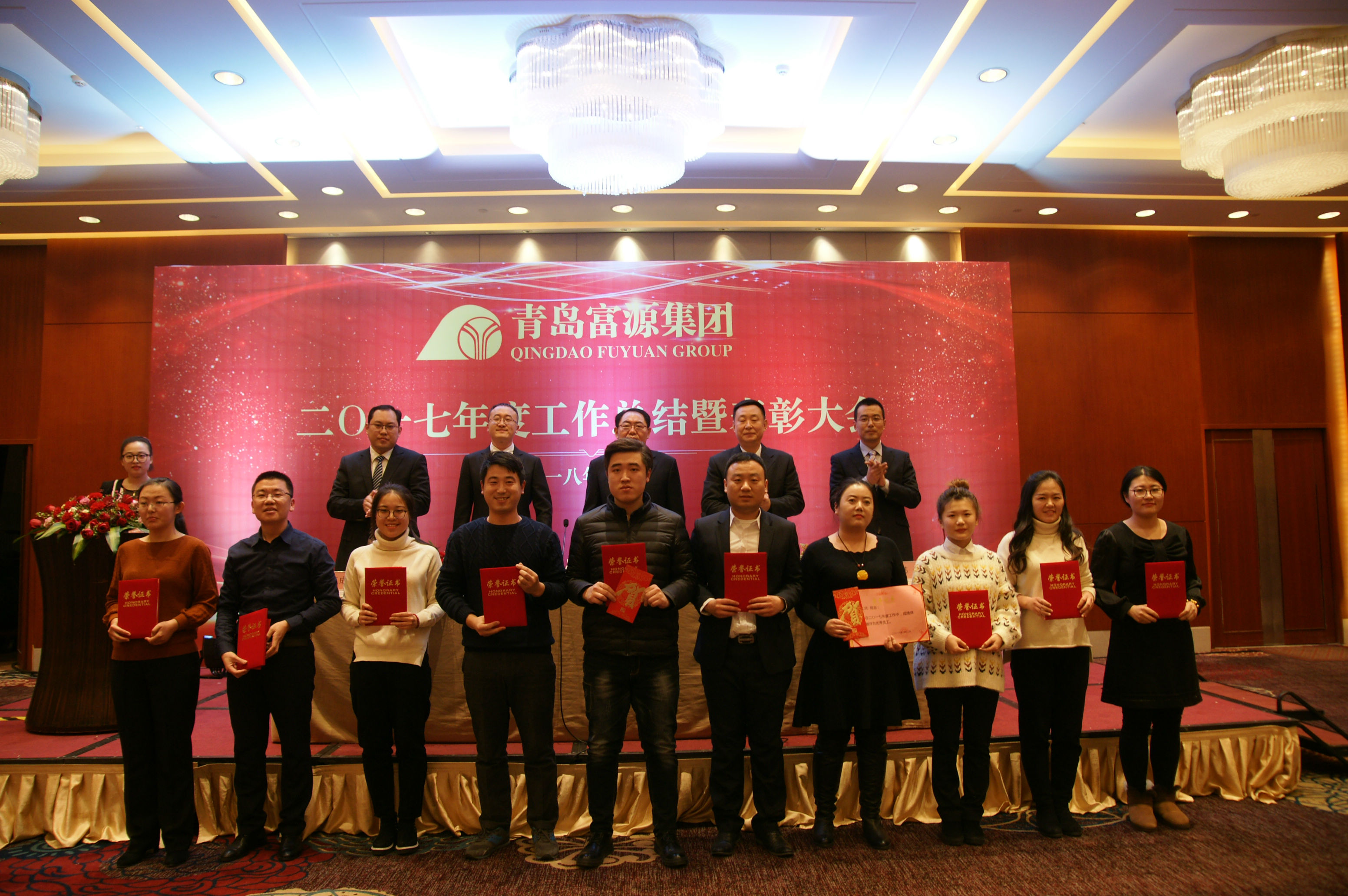 2018年2月2日,青岛富源集团2017年度工作总结暨表彰大会在青岛海景花园大酒店举行。集团创始人、理事会名誉主席孙久学,集团董事长、总裁崔文涛,副总裁王文忠、韩磊、刘玉成出席会议并在主席台就座。集团各公司、部门代表共170余人参加了会议。会议由集团人力资源部经理金晓娇主持。